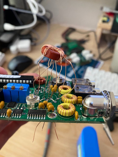 The first power output was not very high, somewhere below 1 Watt. By adjusting some of the toroids’ windings as described in an excellent youtube video from QRP-Labs, I was able to get about 5 Watts output at around 13 Volts at the input.